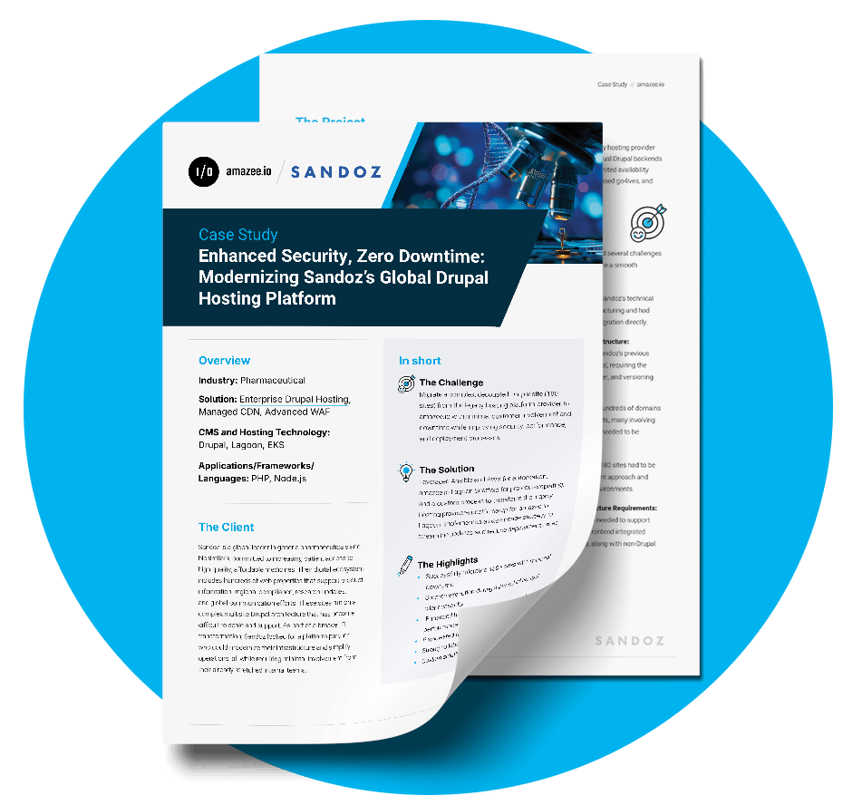 When Sandoz, a global pharmaceutical leader, needed to modernize their vast digital ecosystem, they faced a daunting challenge: migrating over 180 complex, decoupled Drupal sites from a restrictive legacy hosting provider. This transition was complicated by a severely limited internal time capacity, no direct access to the legacy infrastructure, and the need to preserve thousands of path-based redirects across hundreds of domains. The mandate was clear: achieve enhanced security, deliver improved performance, and drastically reduce operational complexity, all while ensuring minimal disruption. This case study details how amazee.io tackled these unique constraints, treating the migration not just as a transfer, but as a complete architectural transformation.